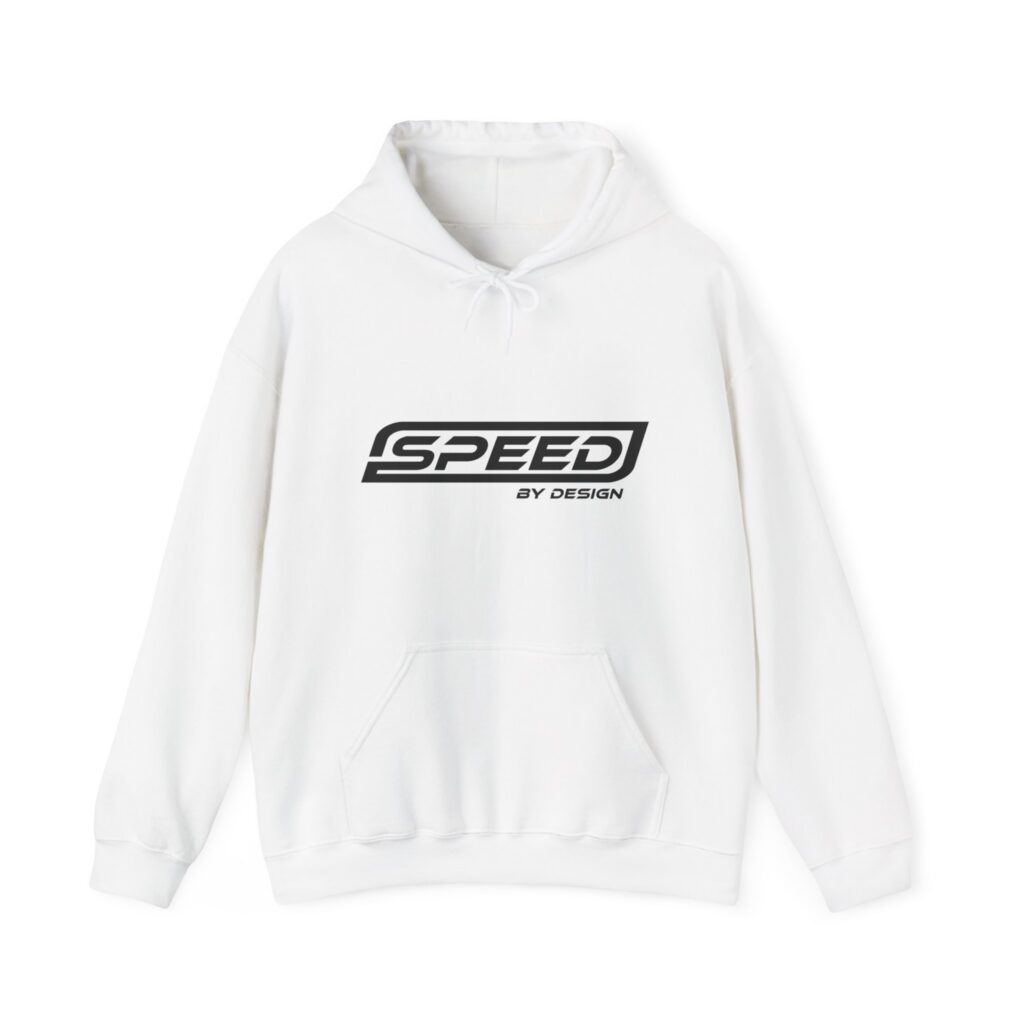 Lightweight warmth with a motorsport edge — this hooded sweatshirt wears like a lived-in favorite. The clean white canvas puts the bold “SPEED by Design” logo front and center, while the roomy kangaroo pocket and double-lined hood keep you comfortable on cold morning drives or late-night garage sessions. Soft yet resilient fabric holds prints and embroidery crisp wash after wash. It settles into your rotation for track days, pit-stop hangs, and any time you want to carry a sleek, engineered vibe.