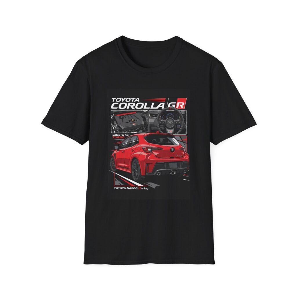 Feel the throttle and the pulse of the street. This lightweight cotton tee carries a bold, automotive art print: a striking red Toyota Corolla GR seen from the rear, with cockpit details and racing-inspired typography. It’s built to be lived in — breathable, soft, and made to hold its shape through drives, meet-ups, and long afternoons under the garage lights. Wear it with jeans or layer it under a jacket; it brings a quiet confidence for anyone who loves tuned machines and track-day energy.